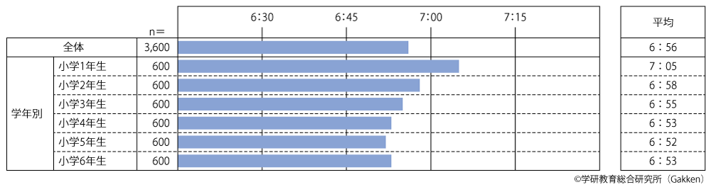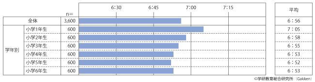 一方、学年別で見ると、学年が上がるにしたがって少しずつ早起きになっていることが分かる。しかし、「就寝時刻」ほど大きな変動はないことを考えると、小学1年生と小学6年生の睡眠時間は45分ほど短くなっていると考えられる。