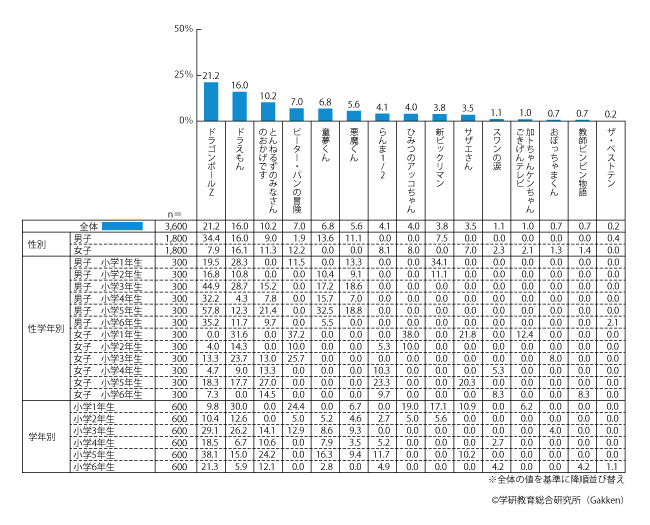 学年別に見ると、アニメ番組は低学年ほど人気が高く、バラエティ番組・ドラマ・音楽番組は高学年ほど人気が高い。ただし、「ドラゴンボールZ」は比較的高学年に人気が高く、中でも小学5年生男子の2人に1人以上が好きな番組として挙げている。