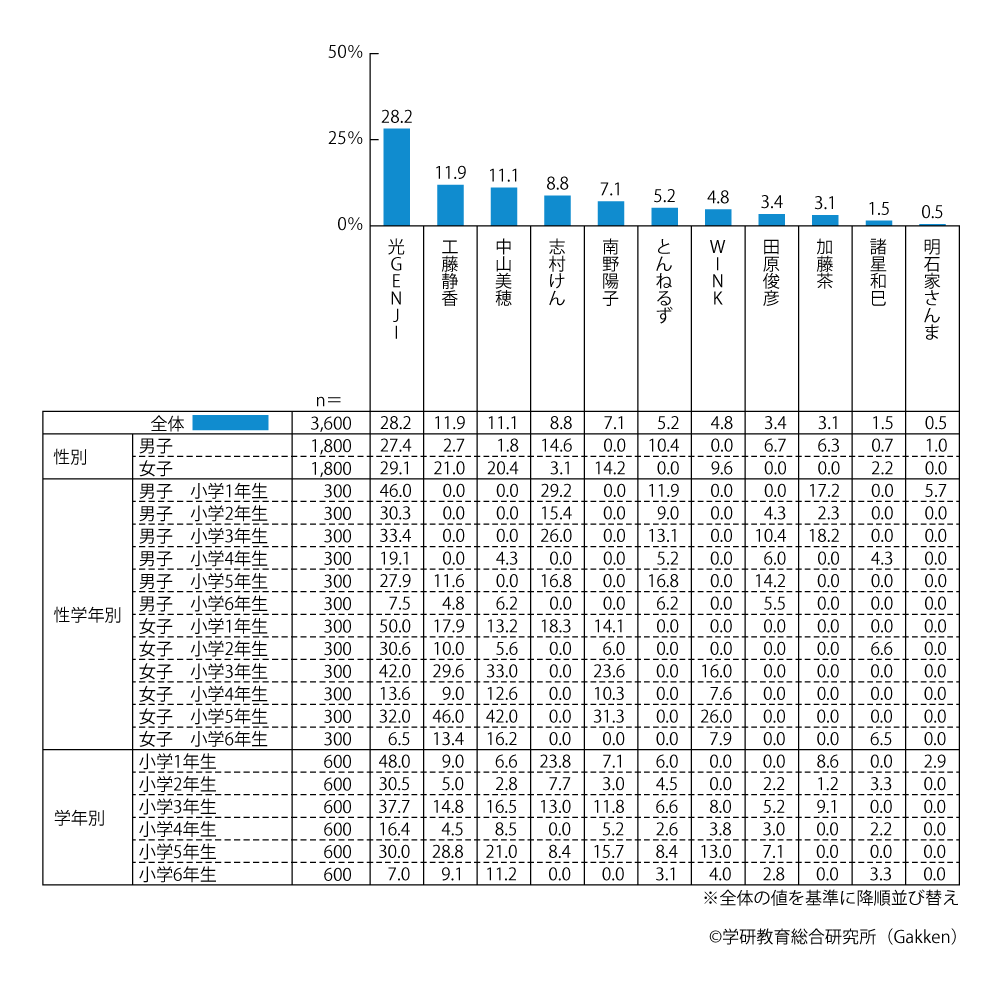 小学生全体では、「光GENJI」(28.2%)がダントツであった。「光GENJI」は男女共に1位を獲得しており、小学生に幅広く支持されていたことが分かる。