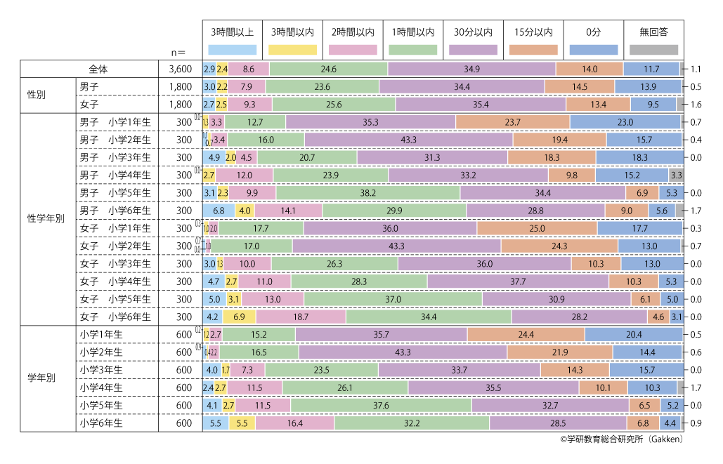 学年別に見ると、読書時間が1日「1時間以内」から「3時間以上」の割合が高い順に6年生(59.6%)、5年生(55.9%)、4年生(42.7%)、3年生(36.5%)、2年生(20%)、1年生(19.3%)となり、学年が上がるにつれて読書時間は増えている。特に高学年になる5年生のタイミングで、読書時間が1日「1時間以上」から「3時間以上」になる割合が半数を超えていることが分かる。
