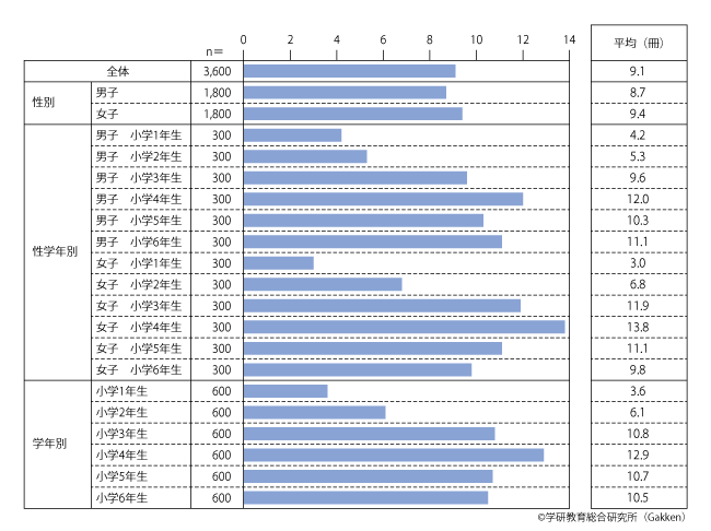 1989年の小学生は、全体平均で1か月に9.1冊の本を読んでいたことが分かった。男子の平均は8.7冊、女子の平均は9.4冊と、男女間に大きな差は出なかった。なお、調査時の条件には漫画を含むかどうかは指定していない。