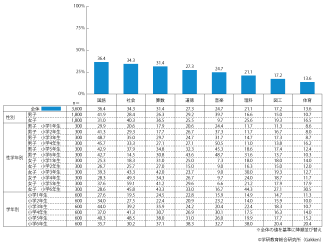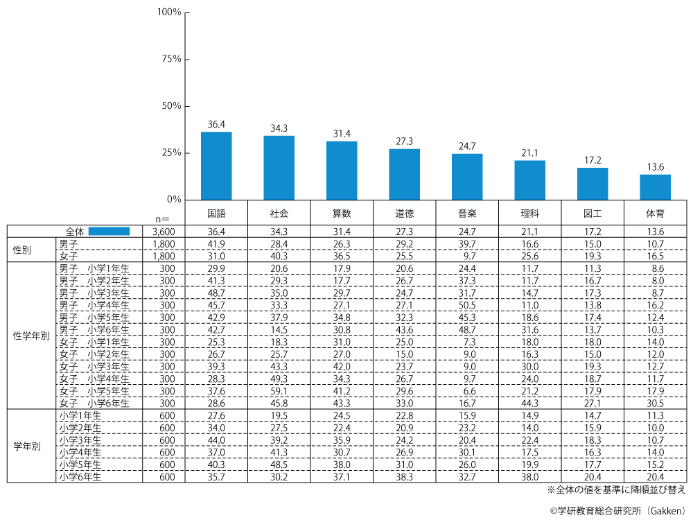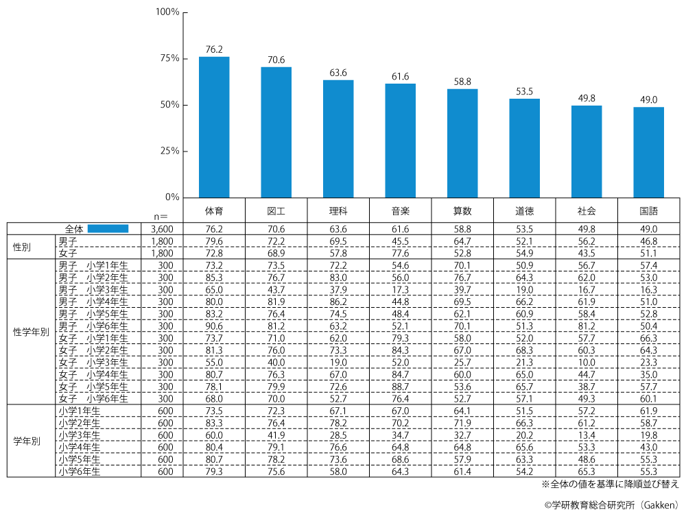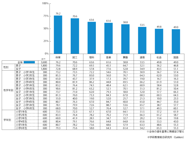 好きな教科は上位から「体育」(76.2%)、「図工」(70.6%)、「理科」(63.6%)、「音楽」(61.6%)、「算数」(58.8%)、「道徳」(53.5%)、「社会」(49.8%)、「国語」(49.0%)であった。1位と最下位では27.2ポイントの大幅な差があることが分かる。