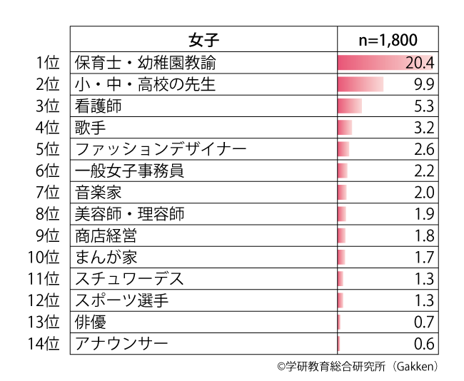 6位の「一般女子事務員」(※1989年調査時の表現ママ)は、男子同様、いわゆる“バブル経済”で好調であった日本において、会社勤めという選択肢は人気が高かったことが見て取れる。