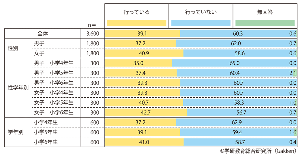 塾・習い事に「行っている」と答えたのは、全体で39.1%。男女別に見ると男子が37.2%、女子が40.9%と、わずかに女子の方が高い。学年別に見ると小学4年生が37.3%、5年生が39.1%、6年生が41.0%と、学年が上がるごとに漸増するが、ほぼ4割だと言える。
