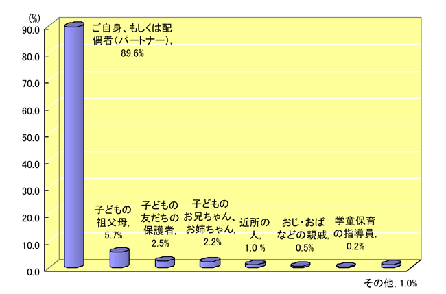 震災当日、学校での「引き渡し」で、子どもを迎えに行った人は誰なのか。「保護者」が9割近くにのぼっており、圧倒的多数である。「祖父母」(5.7%)や「お兄ちゃんお姉ちゃん」(2.2%)といった近親者がお迎えに行った家庭も、1割近くいる。震災という危機的な状況にあっては、子どもにとって最も身近な親族がお迎えに行くという傾向が顕著にみられる。記載できる人数等、「引き渡しカード」に関する検討事項はあるが、将来を見通したとき、「引き渡し」のお迎えに関して、親族だけでは対応できない場面が出てくると予測できる。「子どもの友だちの保護者」(2.5%)、「近所の人」(1.0%)といった地域コミュニティの支援も積極的に考えていく必要がある。