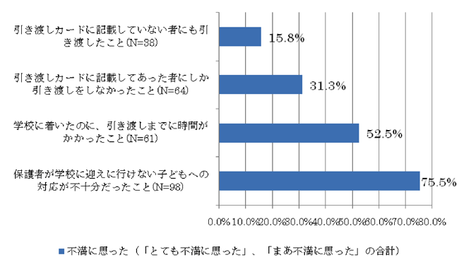 次に、「学校に着いたのに、引き渡しまでに時間がかかった」という経験をした者のうち、約半数の者が、そのことに対して不満に感じている(52.5%)。学校側としては、緊急時であり、手間取ることが多々あったと予測できるが、訓練を重ねることによって、時間短縮を図ることが望まれる。