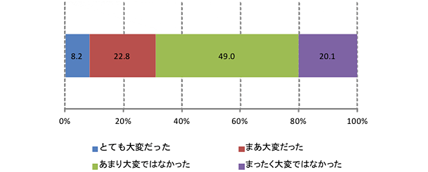 また、「まったく大変ではなかった」が2割を数えているが、これは子どもの学年(年齢)によっても感じ方が異なっていたり、地域によって揺れの大きさに差があったため、人によっては大地震だと感じなかったりしたことが要因であると推察される。実際、他の質問に対する自由記述からは、「こちらの方はそれほど大地震だとおもわなかった」「自宅でも物が落ちる程でもなかったので、子供は学校だし全く心配していなかった」(原文のまま)という回答が見られた。子どもの下校を大変だと思う程度は、さまざまな要因が絡んでいると考えられる。