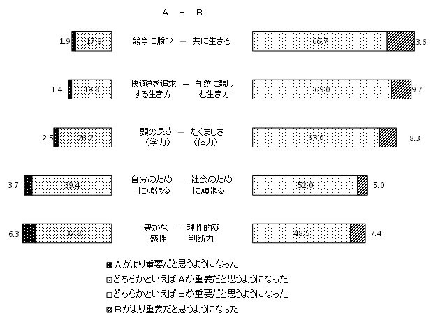 では、震災を経験して、子どもを持つ親たちはこれから子どもにどのような能力や生き方を身につけてもらいたいと思うようになったのであろうか。本調査では、それぞれA・Bと設定した能力や生き方を比較し、大震災の後、「より重要だ」と思うようになったほうを選んでもらった。図1-6はその結果を示している。この結果によると小学生の保護者たちは、「競争に勝つ(19.7%)」よりは「共に生きる(80.3%)」ことを、「快適さを追求する生き方(21.2%)」よりは「自然に親しむ生き方(78.7%)」を、「頭の良さ(学力)(28.7%)」よりは「たくましさ(体力)(71.3%)」を、「自分のために頑張る(43.1%)」よりは「社会のために頑張る(57.0%)」ことを、そして「豊かな感性(44.1%)」よりは「理性的な判断力(55.9%)」を、重要だと思うようになったことがわかる(カッコ内は、A・Bそれぞれの「より重要だと思うようになった」と「どちらかといえば重要だと思うようになった」の回答を合計した値)。まとめると、「ひとりで生きるのではなく、みんなで手を取り合って、自然に親しみながら生きていくこと」、そのために必要なのは「たくましい体と、状況を客観的に把握し判断する理性」である、と言うことができるだろうか。