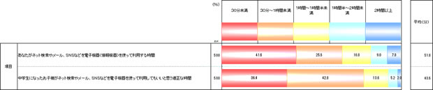 今回は各質問項目の調査結果のクロス集計の集計軸として、男子、女子の性別のほか、①電子機器利用時間(ネット利用時間)=H:1.5時間以上、M:0.5~1.5時間未満、L:0.5時間未満/日、②進学する中学校=公立、公立以外、③就寝時刻=早い:PM10時前、中間:PM10~11時、遅い:PM11時以降、の3項目(それぞれの結果から2~3グループ分類)を基本に設定し、分析した。