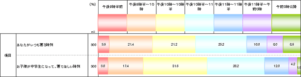 - 保護者が望む子どもの就寝時間(中学進学後)は、午後10時~10時半(31.6%)、午後10時半~11時(28.2%)と午後10時~11時の時間帯で過半数を占める。午後11時までに就寝を望む保護者は全体の82.2%。