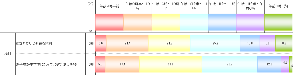 - 小学6年生の就寝時間は、午後10時半~11時が最も高く25.2%。午後9時半~10時(21.4%)、午後10時~10時半(21.2%)を合わせた午後9時半~11時までが中心的な時間帯。午後11時までに就寝する子どもが全体の73.4%を占める。
