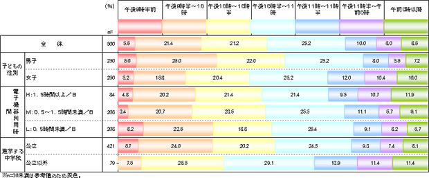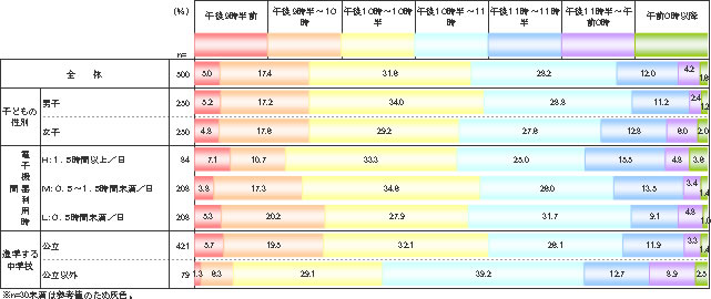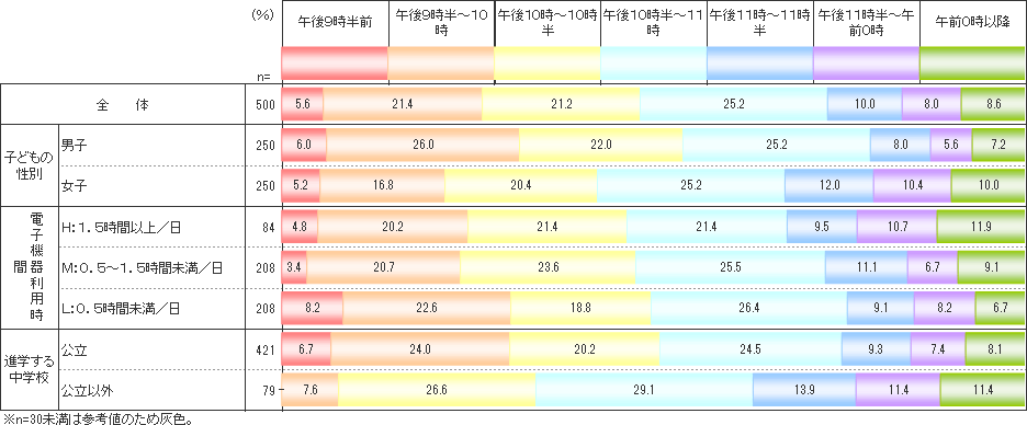 実際に子どもに聞いた就寝時刻を、性別、電子機器(ネット端末)利用時間、進学校する中学校の集計軸でクロス集計した。(上記図5-①)その結果、性別では、女子の就寝時刻が遅い。午後11時以降に寝る子の割合は、男子が20.8%に対して、女子は32.4%になっている。 また、電子機器利用時間では、もっとも多く利用しているH層(1.5時間以上/日)が、32.1%で、L層(0.5時間以下/日)24.0%と差が顕著に出た。 この二つの集計軸(性別、電子機器利用時間)の結果から、スマホ、LINEが女子に広まり、ネット利用時間が長くなっている…ということがうかがわれる。 上記とは違う視点、進学する中学校でみてみよう。都市部に多い、普通の公立中学校(3年制)以外の私立、国立などに進む予定の子どもは、36.7%が11時以降に就寝している。中学入学に選抜試験などの受験が必要な子どもたちは、小学時代から夜遅くまで「受験勉強」に追われている、のかもしれない。