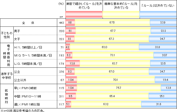 「電子機器利用時間の長短」と「就寝時刻の早い遅い」ではっきりと因果関係が認められた。ネットの時間が1.5時間以上の子の家庭では33.8%、就寝時刻が11時以降の子の家庭では31.6%と3割以上、家庭内ルール無し、ということだった。