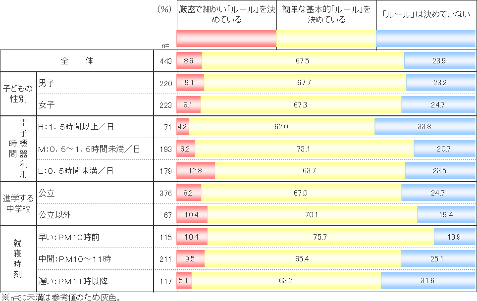 結果は、8.6%が「厳密で細かいルールを決めている」、67.5%が「基本的なルールを決めている」と全体の76.1%が何らかのルールを決めていた。一方、23.9%の家庭では「ルールは決めていない」ということだった。