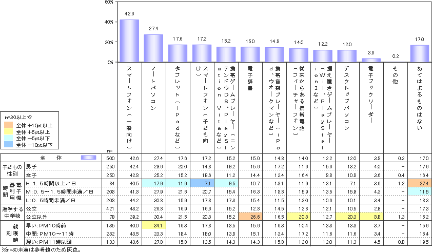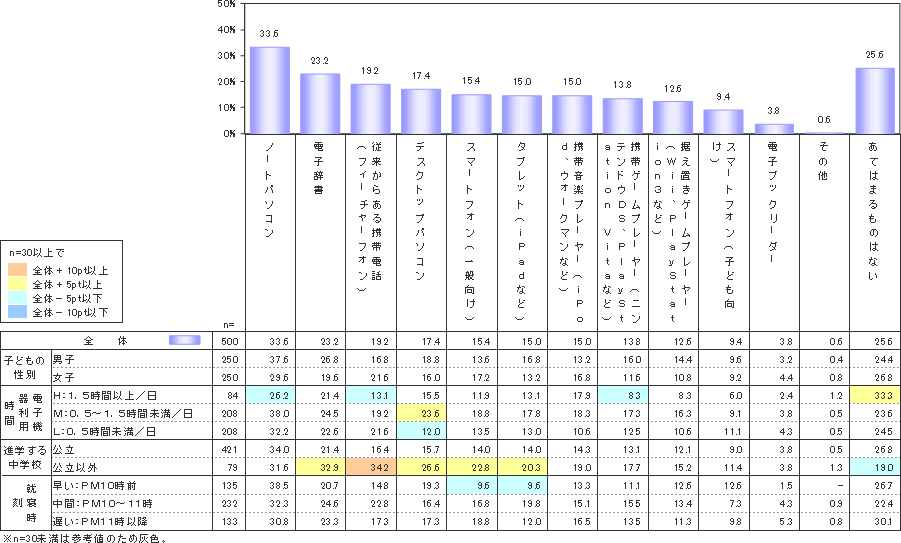 一方、保護者の支持を集めているのが、「ノートパソコン」で全体では33.6%、性別では男子、また就寝時刻の早い層(10時前)では4割近い高い数値を示している。子どもの支持の高いスマートフォンに関しては、一般向け15.4%で、子どもが4割が希望している結果とは、倍以上の開きがある。また、最も利用時間の長いH層(1.5時間以上)の子どもの保護者は、子ども同様に「あてはまるものがない」が高く33.3%という値だった。