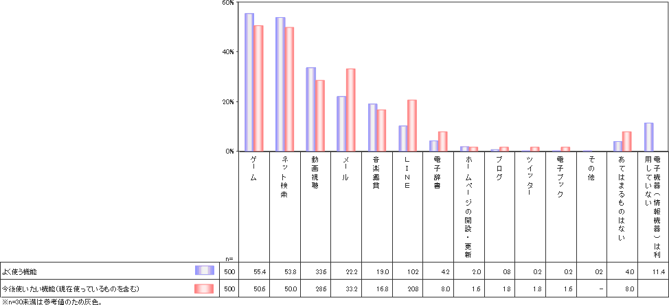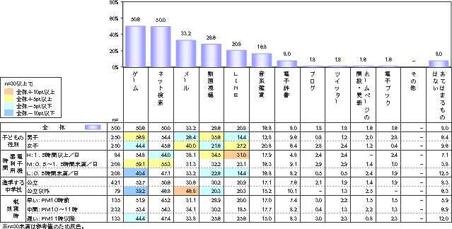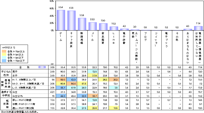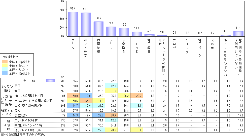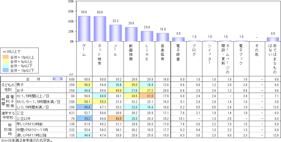 現在よく使う機能では、女子の「メール」使用が31.6%で男子の12.8%と顕著な男女差が出ている。また電子機器の利用時間が最も長いH層(1.5時間以上)では、音楽26.2%、LINEが20.2%と他の層に比べてかなり高い値の結果だった。公立(3年制)以外の中学校に進学する層で高いのが、「メール」機能で36.7%、逆に「ゲーム」「動画視聴」は低くなっている。就寝時刻で見てみると、やはり最も遅い層(11時以降)で、メール28.6%、動画視聴27.8%、LINE15.8%と他の層にくらべ高くなっている。