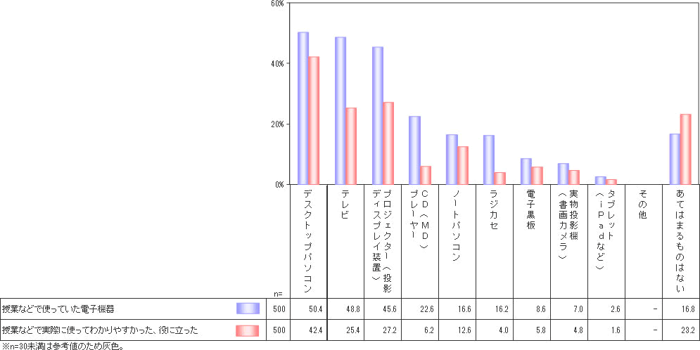 授業で使っていた電子機器で多いのは、デスクトップパソコン50.4%、テレビ48.8%、プロジェクター45.6%。また実際に、理解に役立ったかどうかの問いでは、パソコン42.4%、プロジェクター27.2%、テレビ25.4%となっている。
