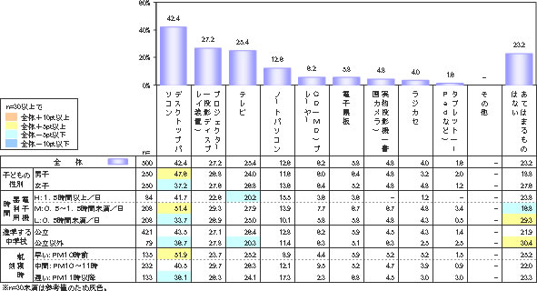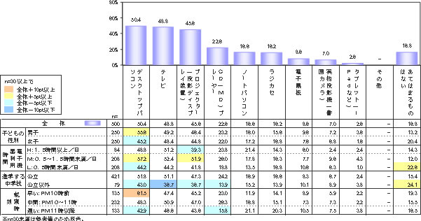 上の二つの図表は、「利用したことがあるもの」「役立ったもの」を、性別、電子機器利用時間などの集計軸でクロス集計したものだ。性別で差が出たのはデスクトップパソコンで、「利用経験」「役立った」ともに男子が女子を約10%上回っている。また就寝時刻が早い層(10時前)では、デスクトップパソコンの利用経験が特に多くなっている。そのほかでは、公立(3年制)以外に進学するこどもが、「利用経験」「役立った」どちらでも、「あてはまるものがない」が、ほかの層にくらべ高くなっている。
