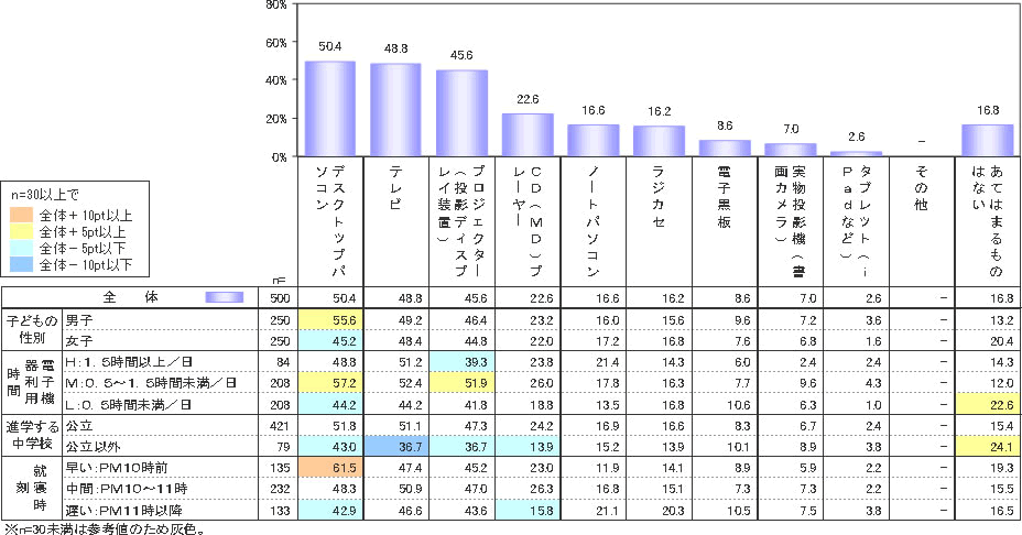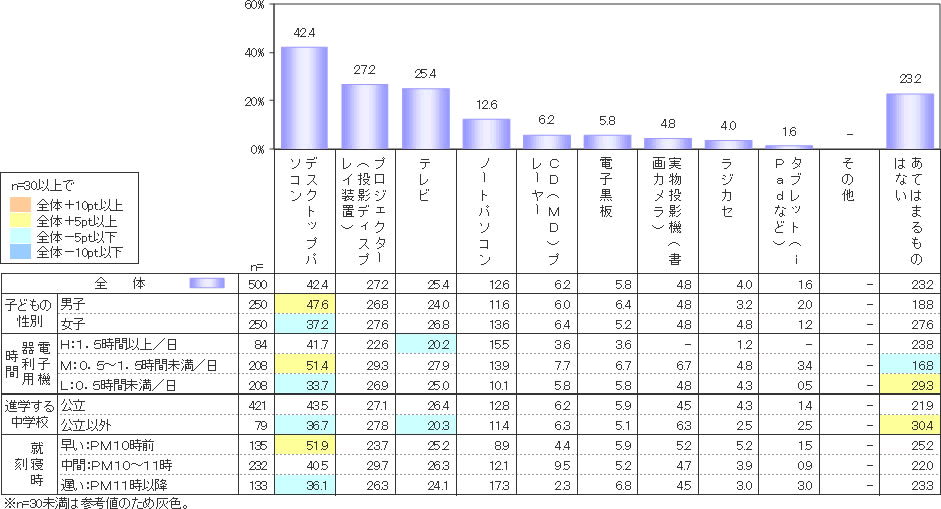 デスクトップ、ノートを合計するとパソコン自体では67%で多くの子どもが利用したことがあり、55.0%の子どもが役立ったと評価している。ただ、従来からあるテレビ、プロジェクターなどは役立ったという評価は低い。また役立ったもので、「あてはまるものがない」23.2%と、電子機器に対して子どもの評価はきびしいものがある。