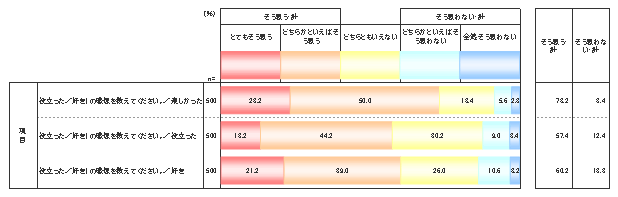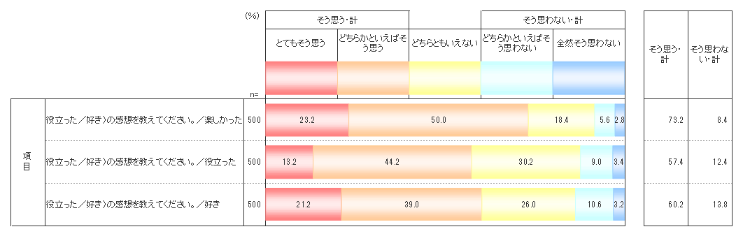 小学校6年生に対して5・6年生で行われている英語の授業(外国語活動)についての感想を聞いてみたところ、上のグラフのとおり、「楽しかった(そう思う計)」は73.2%、「役立った(そう思う計)」は57.4%、「好き(そう思う計)」は60.2%と、おおむね好評だったことがわかる。現行の外国語活動が多くの小学生に受け入れられている実態が確認された。一方、「楽しかった」の比率の高さに比べると、「役立った」「好き」の比率が少し低いが、これは小学生には英語を実際に生かす場面がまだそれほど多くないことが影響している可能性が考えられよう。