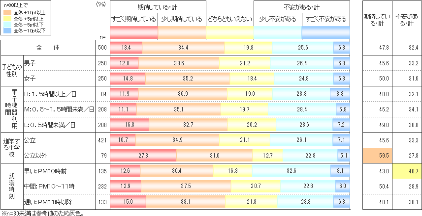 進学中学校別では、地元の公立中学校以外に進学する子どもは、「期待している計」が59.5%と、地元の公立中学校に進学する子どもの45.6%より高かった。逆に、「不安がある計」では、地元の公立中学校以外に進学する子どもの方が低いという傾向にある。この傾向の分析には英語と他教科の比較を行う必要があるが、受験勉強の有無が関係している可能性がある。