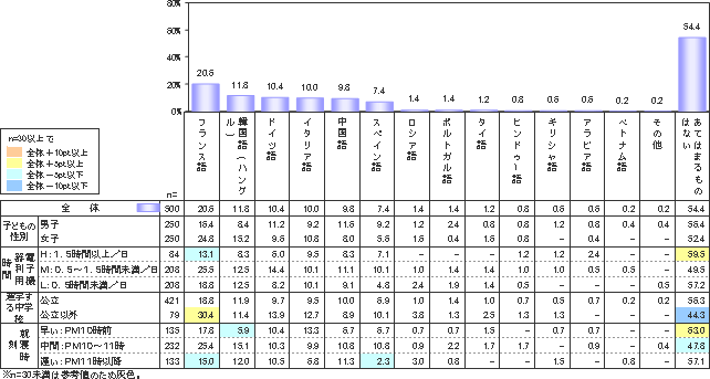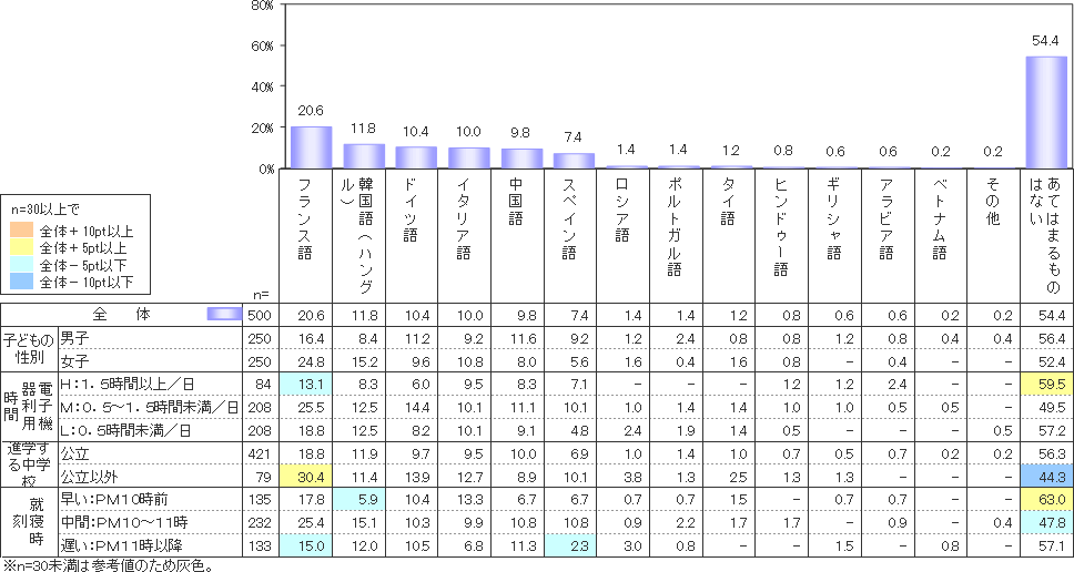 一方、全体の半数以上(54.4%)が「英語」以外で「興味のある外国語がない(あてはまるものはない)」と答えるなど、「英語」以外の外国語への関心があまり高くないことが明らかとなった。このことは、今後、多文化社会の到来が本格化していく中での課題といえるかもしれない。