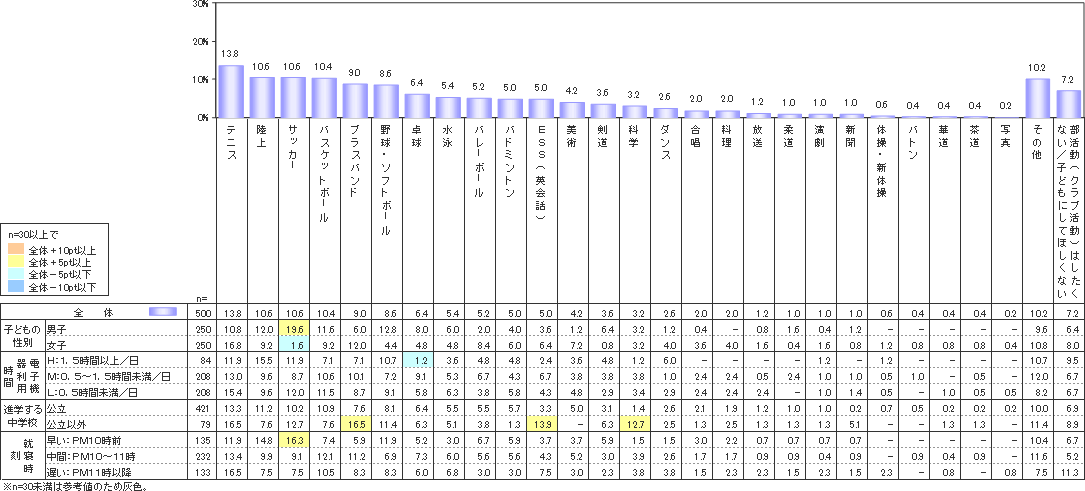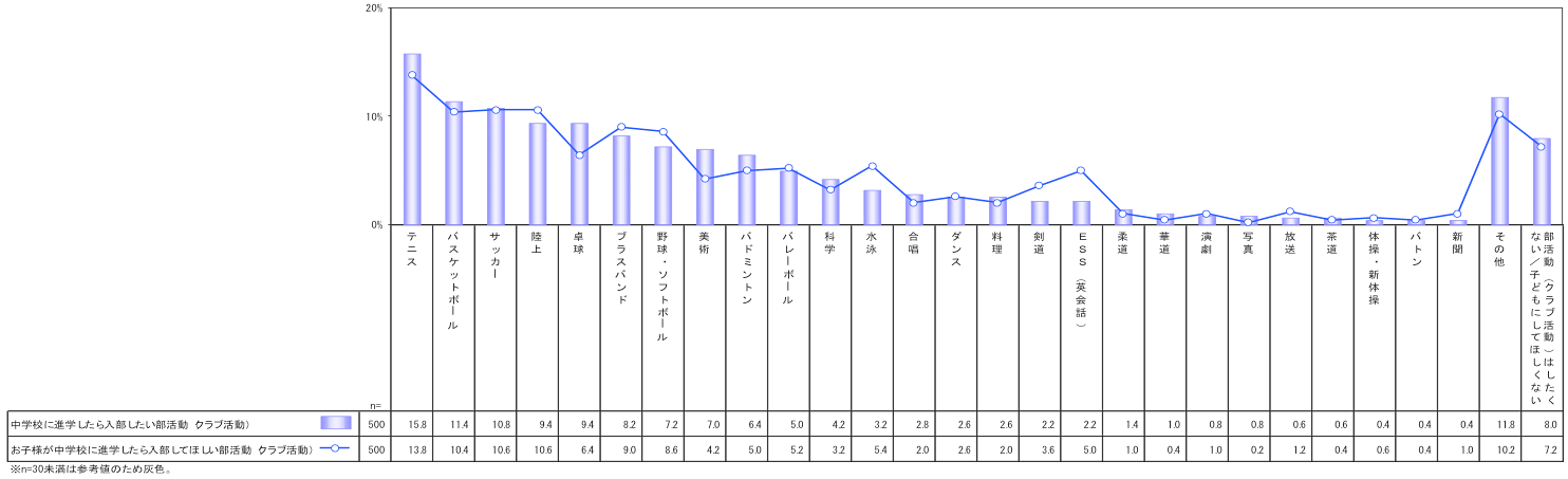 同様の質問を保護者にした結果が、上の図表の折れ線グラフだ。ほぼ子どもと同じで上位は「テニス」(13.8%)、「サッカー」(10.6%)、「陸上」(10.6%)、「バスケットボール」(10.4%)で、運動部への入部を支持しているようだ。また子どもの人気はそれほどでもないが、保護者の支持を集めているのが「水泳」(5.4%)、「ESS(英会話)」(5.0%)だ。