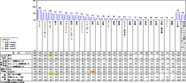 子どもの人気を集めたのが、上位から「テニス」(15.8%)、「バスケットボール」(11.4%)、「サッカー」(10.8%)がベスト3。続いて「陸上」(9.4%)、「卓球」(9.4%)、「ブラスバンド」(8.2%)となっている。スポーツの大会で応援にかりだされ、日ごろの楽器の練習もハードな「ブラスバンド」をはじめ、上位には運動部が並んでいる。文化系では「美術」(7.0%)、「科学」(4.2%)に一定の支持があるようだ。