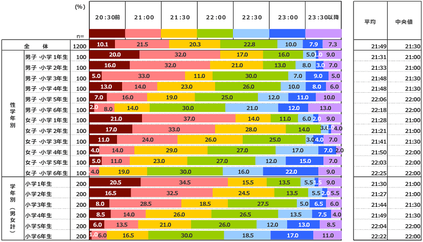 前述の「起床時刻」とは異なり、こちらは学年が上がるにつれて、遅い時刻になっている。グラフの下部、学年別(男女計)でみると、その傾向が明確だ。1年生では「20:30前」20.5%が6年生では1.0%。逆に「23:30以降」は1年生が9.0%、6年生が11.6%となっている。起床時刻が学年で変わっていないので、高学年になるほど、睡眠時間が減っているということになる。低学年では平均で9時間ぐらい寝ているが、高学年では8時間ぐらい、約1時間少ない計算となる。