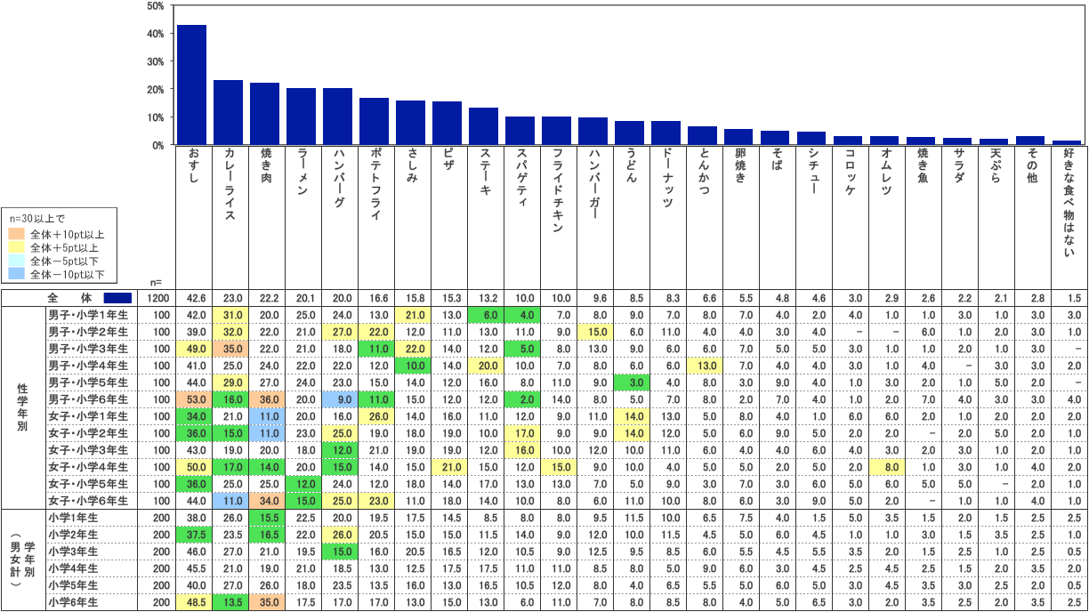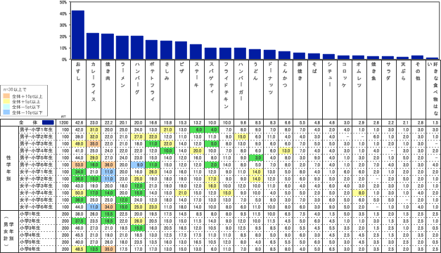 男女別でみてみると、カレーライスは女子より男子に人気が高く、特に低学年では3割以上の子が好きと回答している。学年別では、「焼肉」は小学6年生に人気で男女ともに3割以上の支持がある。同じ「肉食」でも「ハンバーグ」は低学年に人気がるようだ。