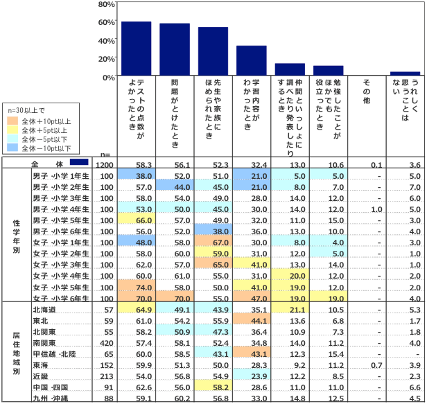 「あなたが勉強をしていて嬉しく思うことはどんなことですか?」を選択肢方式で質問したところ、【図5-④】の結果となった。それによると、小学生全体で見ると、「テストの点数がよかったとき」が58.3%と最も高く、「問題がとけたとき」(56.1%)、「先生や家族にほめられたとき」(52.3%)、「学習内容がわかったとき」(32.4%)、仲間といっしょに調べたり発表したりするとき」(13.0%)、「勉強したことがほかでも役立ったとき」(10.6%)、などが続く。もう少し細かく見ると、「テストの点数がよかったとき」について、男女ともに小学1年生で低く、学年が上がるにつれて高くなる傾向にある(男女とも最も高いのが5年生)。テストの点数への関心や意味合いが増していく事情が表れているのではないか。「問題がとけたとき」については、男子より女子の方が若干高い傾向にあり、また、女子・小学6年生で70.0%と最も高くなっている。「先生や家族にほめられたとき」については、男子・小学6年生で低くなっている(38.0%)一方、相対的に女子の方が高い(とくに女子・小学1年生と3年生)という特徴が見られる。