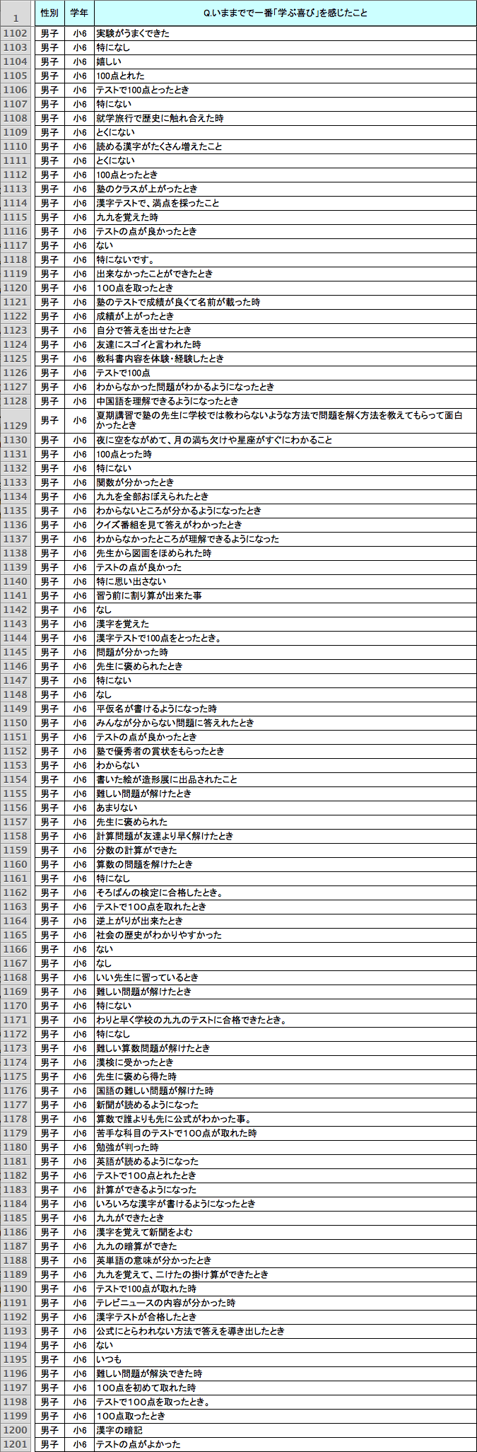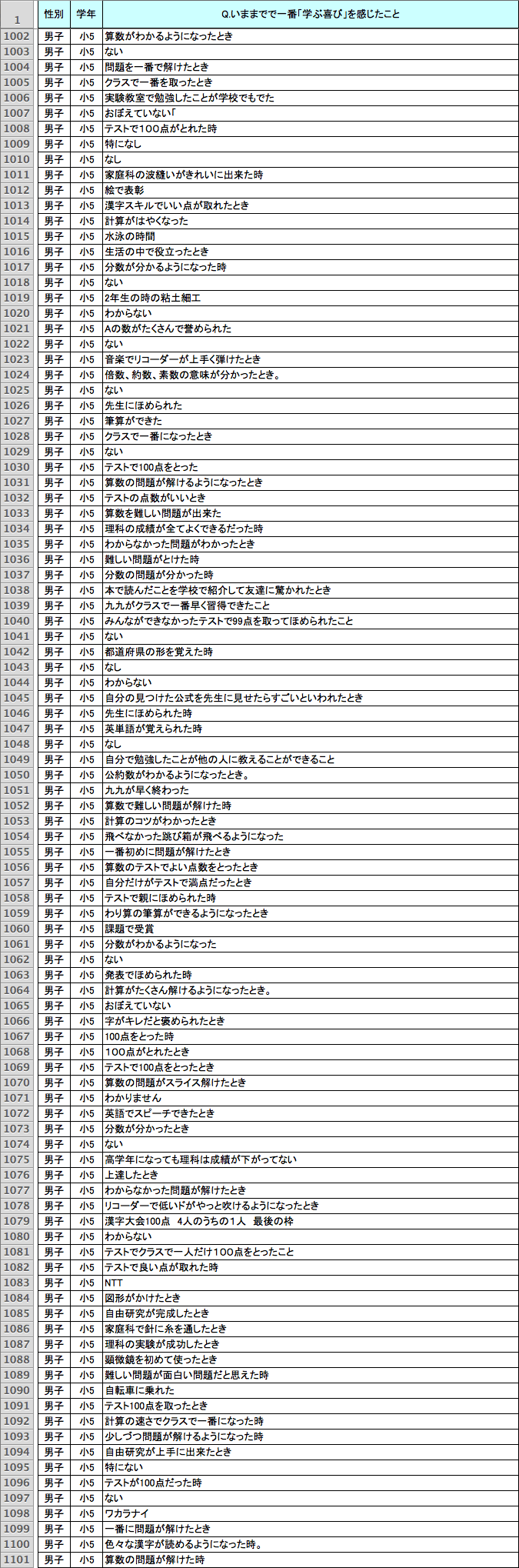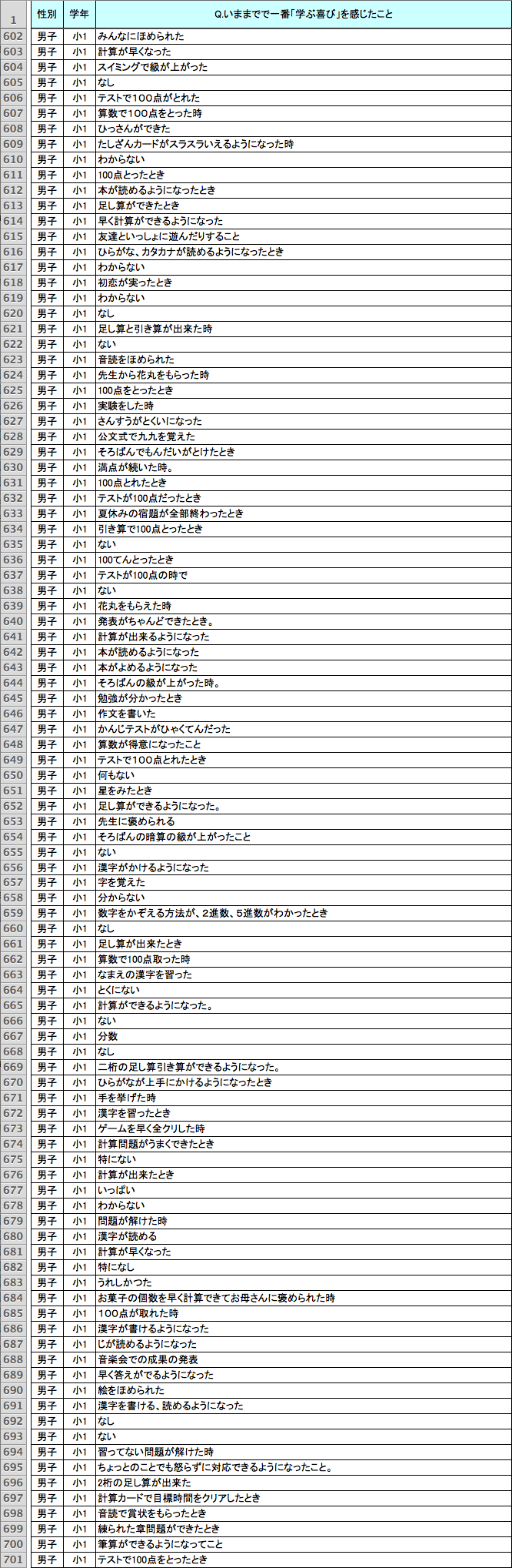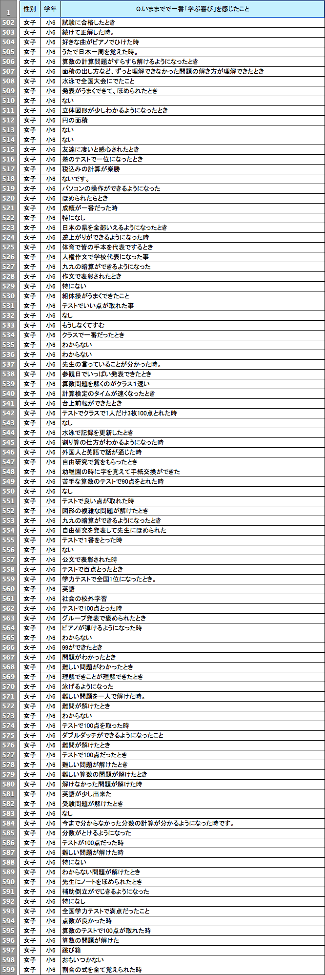 読み書きと同様、「計算」に関する回答も多い。とくに低学年では、「九九が言えるようになった」とか「足し算引き算ができるようになった」が多く、学年が上がるにつれて、「繰り上がり・繰り下がり計算ができるようになった」「2ケタ・3ケタのかけ算ができた」「分数ができるようになった」「コンパスや定規が使えるようになった」「図形の問題(たとえば面積の計算)が解けた」「文章題(たとえば鶴亀算)が解けた」といったときに喜びを感じた、など多様な回答が増える。なかには、「お父さんがおつりをごまかそうとしたのを見つけたとき」(女子・小学4年生)というユニークな回答もあった。