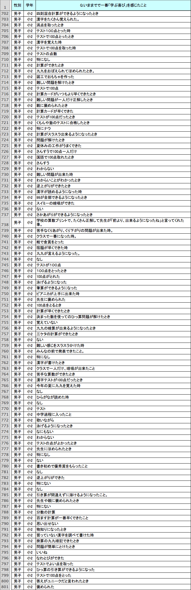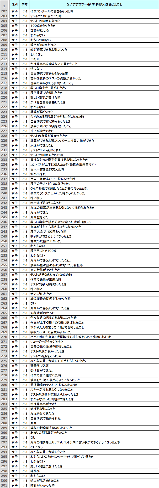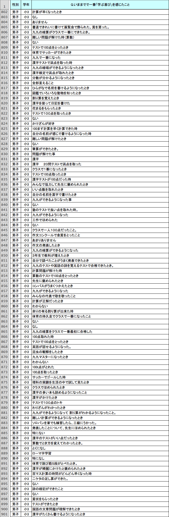 読み書き計算以外でも、さまざまな回答があった。「逆上がり」「跳び箱」「水泳」「縄跳び」「自転車」など身体に関する技能を身につけたとき、「授業のとき友達といっしょに発表してほめられた」「友達といっしょに勉強した」「お父さんといっしょに自由研究をした」など他者と協力して何かをなし遂げたとき、「全都道府県名を言えるようになった」のように新しい知識を得たとき、といった回答や、コンクールなどで賞をとったときを挙げる回答もあった。