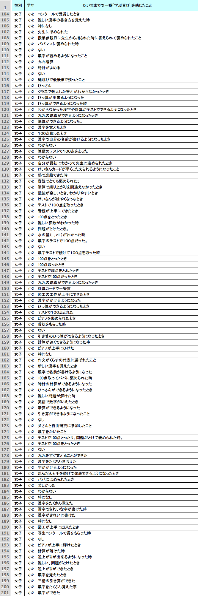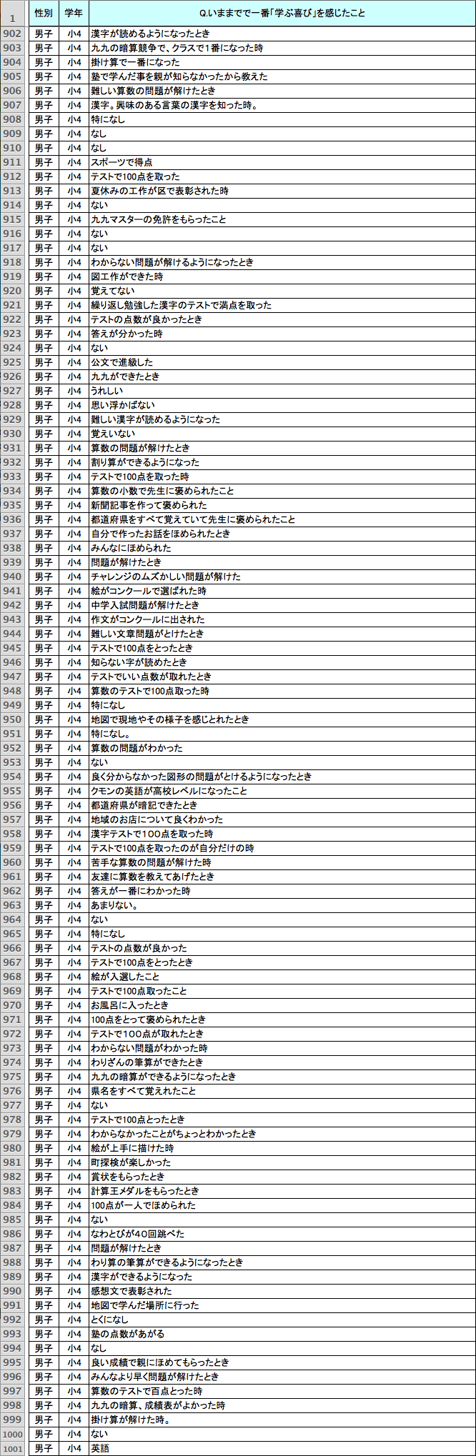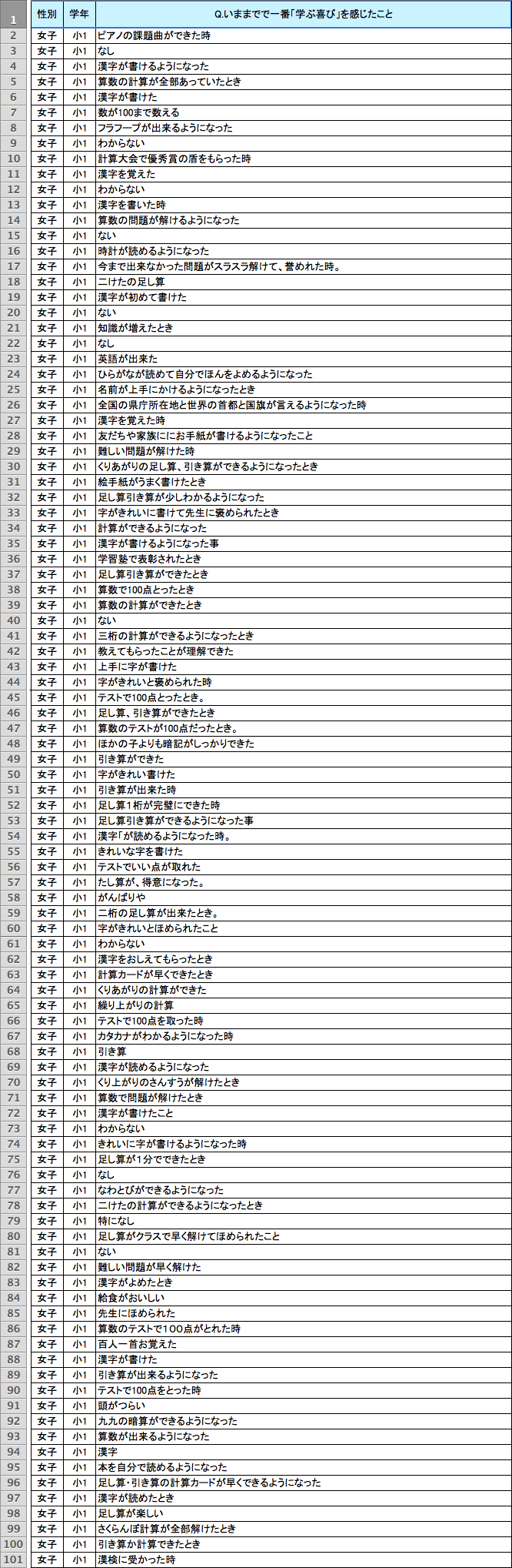 読み書き計算以外でも、さまざまな回答があった。「逆上がり」「跳び箱」「水泳」「縄跳び」「自転車」など身体に関する技能を身につけたとき、「授業のとき友達といっしょに発表してほめられた」「友達といっしょに勉強した」「お父さんといっしょに自由研究をした」など他者と協力して何かをなし遂げたとき、「全都道府県名を言えるようになった」のように新しい知識を得たとき、といった回答や、コンクールなどで賞をとったときを挙げる回答もあった。