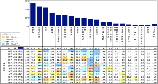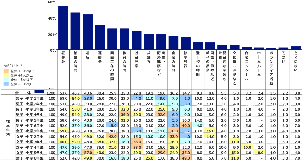 男女別・学年別に分けた場合に見られるいくつかの特徴としては、「遠足」について男子・小学1年生で相対的に少し低い一方で女子・小学5年生で少し高い、「図画工作」について男子・小学6年生で低く女子・小学2年生で高い、「社会見学」について男女とも小学1年生で低い、「音楽の時間」については男子と女子で大きな差があり女子が高い、などが指摘できる。