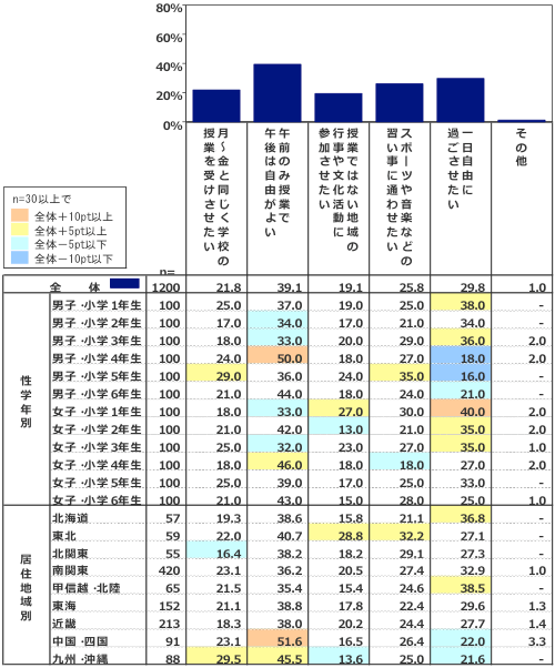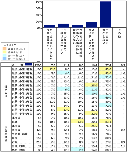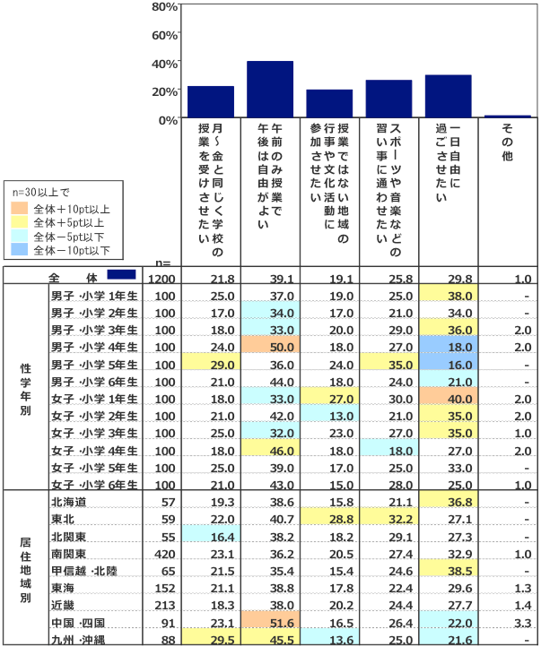 小学生に「あなたは、土曜日をどんな風に過ごしたいと思いますか?」という質問を、保護者に「あなたは、お子さまに土曜日をどんな風に過ごしてほしいとお考えですか?」という質問を行った結果が、【図5-⑦】~【図5-⑨】である。そのうち、小学生と保護者の集計表である【図5-⑦】から、双方の要望の違いが浮き彫りになった。まず、小学生自身は、「一日自由に過ごしたい」が77.4%と圧倒的に高く、「スポーツや音楽などの習い事に通いたい」(16.4%)、「午前のみ授業で午後は自由がよい」(11.2%)と続き、「月~金と同じく学校の授業を受けたい」との回答は7.0%と低い。一方、保護者については、「午前のみ授業で午後は自由がよい」が39.1%と最も高く、「一日自由に過ごさせたい」は29.8%で2番目で、続いて「スポーツや音楽などの習い事に通わせたい」(25.8%)、「月~金と同じく学校の授業を受けさせたい」(21.8%)であった。土曜授業を希望するという小学生の声は多くはなかったが、保護者としては午前のみなら土曜授業を希望するという声が多いことが分かる。小学生の男女別・学年別の回答状況を示した【図5-⑦】を見ると、学年ごとの分散(ばらつき)が大きい項目が多いものの、男女間で比較した場合、「午前のみ授業で午後は自由がよい」に関しては概ね女子の方が男子より高い傾向が見られる。保護者についての状況を示した【図5-⑧】からは、男女ともに、低学年で「一日自由に過ごさせたい」が高い一方で、中学年以降はその比率を「午前のみ授業で午後は自由がよい」とする比率が上回っていく傾向が見られる。