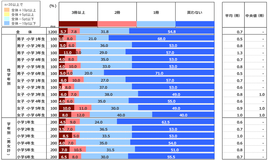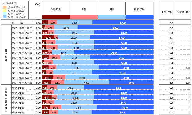 「あなたは、1か月の間に何冊ぐらい本を買いますか?」との質問に対する回答結果は、上の【図6-②】のとおりとなった。それによると、小学生が1か月に購入する本の平均冊数は0.7冊(中央値は0.0冊)と、ほとんど購入しておらず、前質問項目の1か月間の読書冊数(平均5.6冊)との間に大きなギャップがある事実が明らかになった。男女別・学年別に見ても、学年による大きな差は見られないものの、1か月の間に本を1冊も購入しない小学生が、全学年を通じて5~6割(男子・小学6年生においては71.0%)にも上ることも分かった。