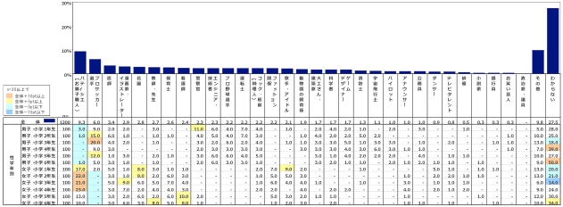 「あなたが将来つきたい職業(仕事)を教えてください」との質問を行ったところ、【図6-⑧】のような結果を得た。それによると、小学生が将来つきたい職業は、「パティシエ」が9.3%と最も高く、「プロサッカー選手」(6.0%)、「医師」(3.4%)、「漫画家・イラストレーター」(2.9%)、「花屋」(2.8%)、「教師・先生」(2.7%)と続く。女子・小学1~4年生で「パティシエ」が、男子・小学2~3年生で「プロサッカー選手」が高いという傾向が見られるが、総じてバラツキが大きく、また、全体の27.5%(男子・小学6年生にいたっては50.0%)が「わからない」と答えるなど、将来つきたい職業イメージがはっきりとしない子がかなりいるようだ。