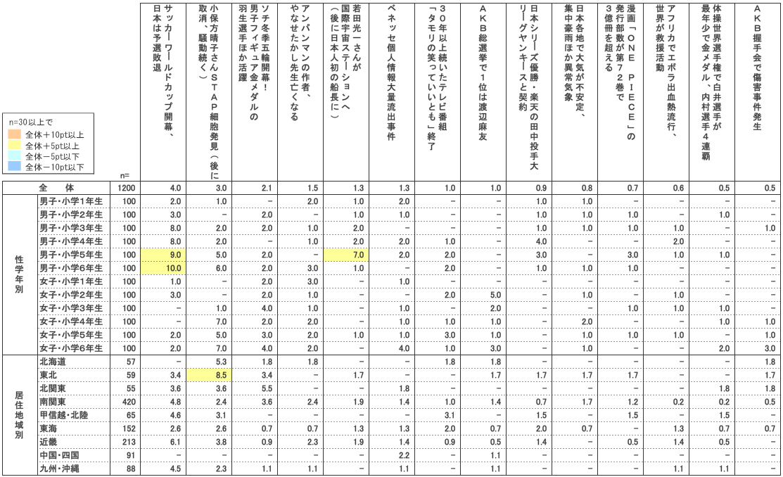 3位は8月末から9月上旬にかけて、マスコミを盛り上げた「テニスの全米オープンで錦織選手が準優勝~」(7.6%)。サッカーW杯の不振で元気がなかった日本のスポーツ界久々の明るいBIGニュースだった。特に男子小学6年生では17.0%が一番に選んでいる。