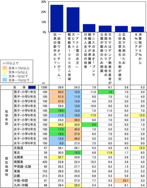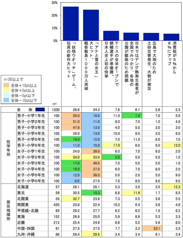 低学年男子(小学1年生~3年生)の約半数が選んだ「『妖怪ウォッチ』ゲーム、玩具の新作大ヒット」が総合第1位(26.6%)、小学生が選んだ最大の出来事だった。また僅差で2位(24.3%)になったのが、「『アナと雪の女王』大ヒット、観客動員1000万人突破」だった。女子小学1年生~6年生まで3~5割の支持を得ている。妖怪ウォッチはマンガ、アニメにくわえて、玩具の「妖怪メダル」が品切れになる人気だった。また、アナと雪の女王は、主題歌がさまざまな言語で歌われる動画がネットで話題となり、劇場でも観客たちが一緒に歌い、話題となった。