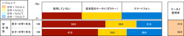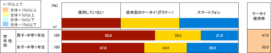 まずは今回2014年9月調査で「携帯電話(ケータイ・スマホ)の使用率」をまとめた結果が上の図表だ。新中1生は、男子47.0%、女子53.0%と全体で約半数が携帯電話を使用している。またスマートフォン(スマホ)に限ってみても、男子21.0%、女子29.0%と使用している率が高くなっている。