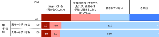 なお、学校への持ち込み状況では、小学校とあまり差はないようで、8割以上の中学校は、携帯持ち込み禁止になっている。