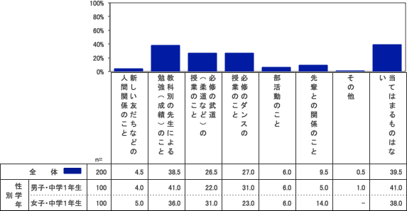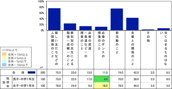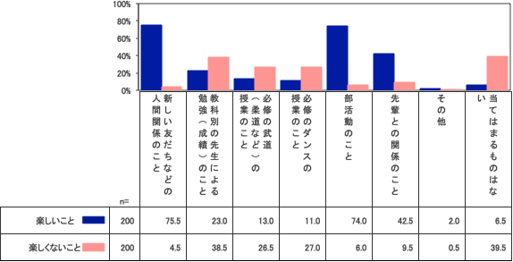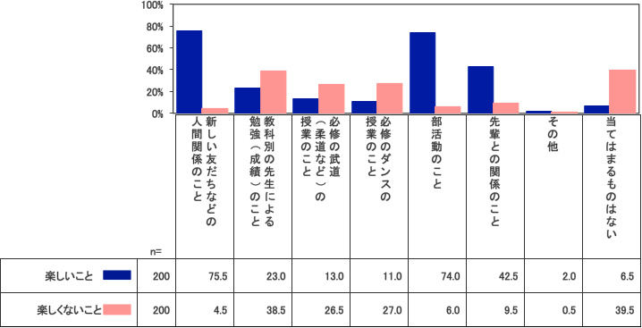 楽しいことでは、「新しい友達などの人間関係」75.5%、「部活動のこと」74・0%の支持が多く、「先輩との関係のこと」も42.5%と比較的、高評価となっている。それぞれ楽しくないと回答している子は1割以下なので、全体としてうまくいっているようだ。