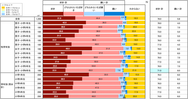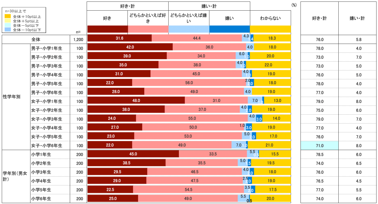 しかし、2011年12月調査の結果では、「好き」は21.8%、「どちらかといえば好き」は71.3%、両者を合わせた『好き・計』93.1%の子どもが自分のことを好きと回答していた。