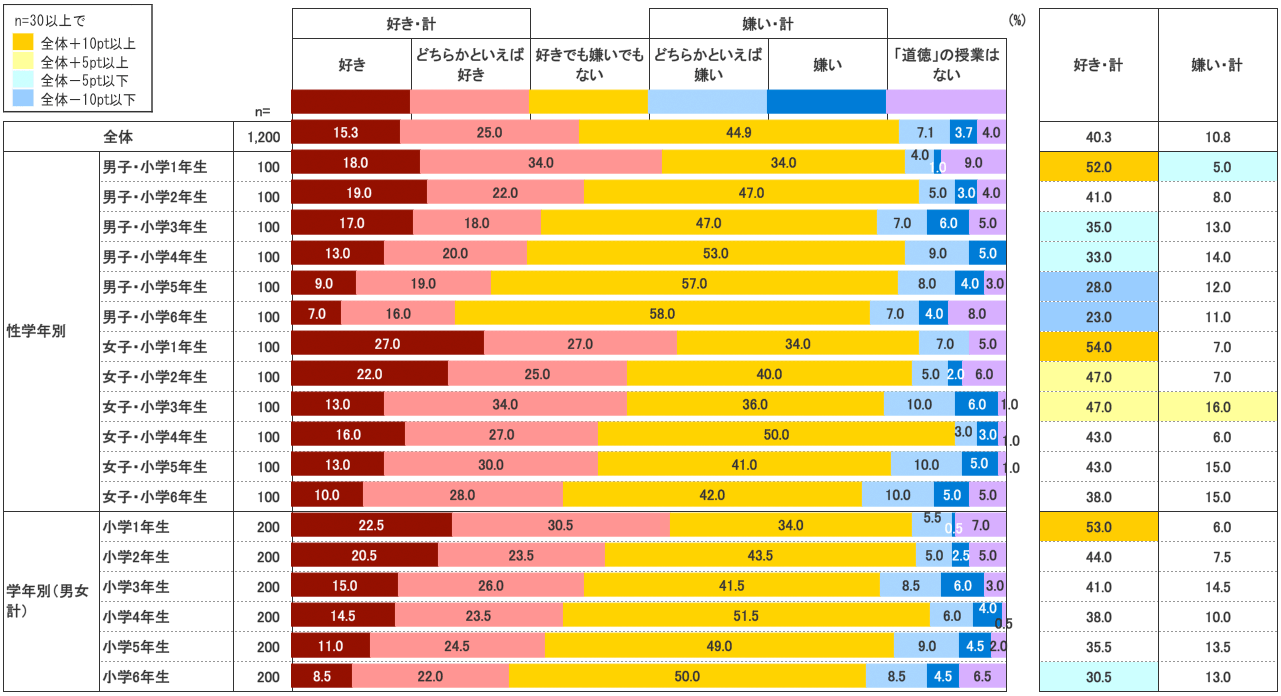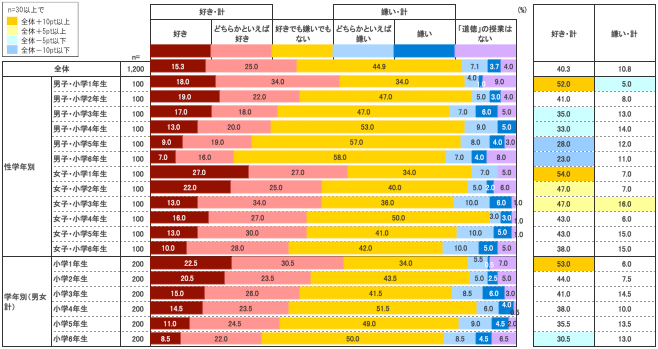 道徳の授業について「好き」と答えたのは全体として15.3%。これに「どちらかといえば好き」25.0%を合わせた『好き・計』は40.3%となった。