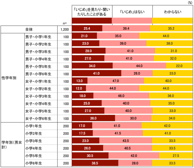 また、学年があがるにつれ、いじめを見たり聞いたりしたことがある比率が増え、1年生では17%が、6年生では38.5%に達している。