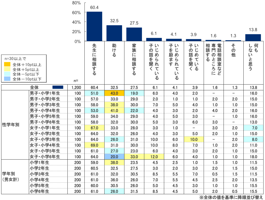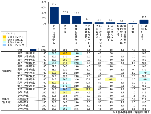 いじめの対処法については、「先生に相談する」が全体の60.4%で圧倒的に高く、以下「助ける」(32.5%)、「家族に相談する」(27.5%)と続いた。(複数選択肢からの回答)
