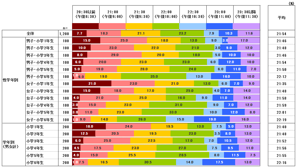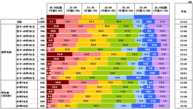 学年別に見ると、学年が上がるにつれて就寝時刻が遅くなっていくことが分かる。特に、5年生から6年生にかけての変化が大きく、午後9時55分から午後10時16分へと一気に就寝時刻が遅くなっている。1年生と6年生を比べると、36分の差(1年生:午後9時40分 → 6年生:午後10時16分)があった。