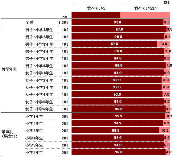 全学年の平均では、93.8%の子がふだん決まった時間に朝食を食べている。2014年9月調査においては、朝食を食べている子の割合は96.5%であったので、少し減少したことになる。この減少がどのような理由で生じたのかは、このデータのみからは判断できないが、来年度以降も継続的に調査して、その動きを追っていきたい。