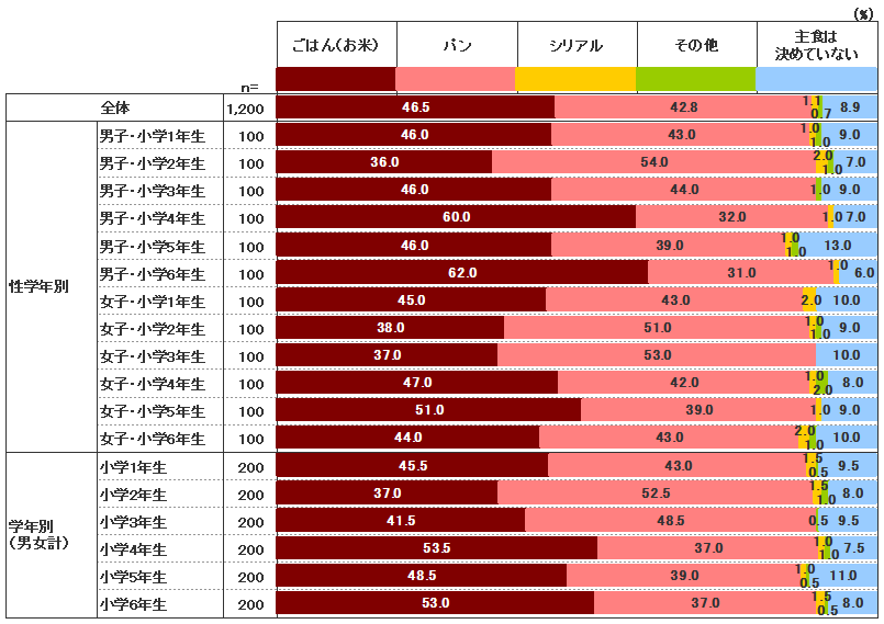 全学年の回答を平均すると、「ごはん(お米)」46.5%、「パン」42.8%、「その他」と「主食は決めていない」は合わせて約1割という結果となった。これは、2014年9月調査の結果(「ごはん」45.6%、「パン」43.4%)と比べて、それほど変わっていない。